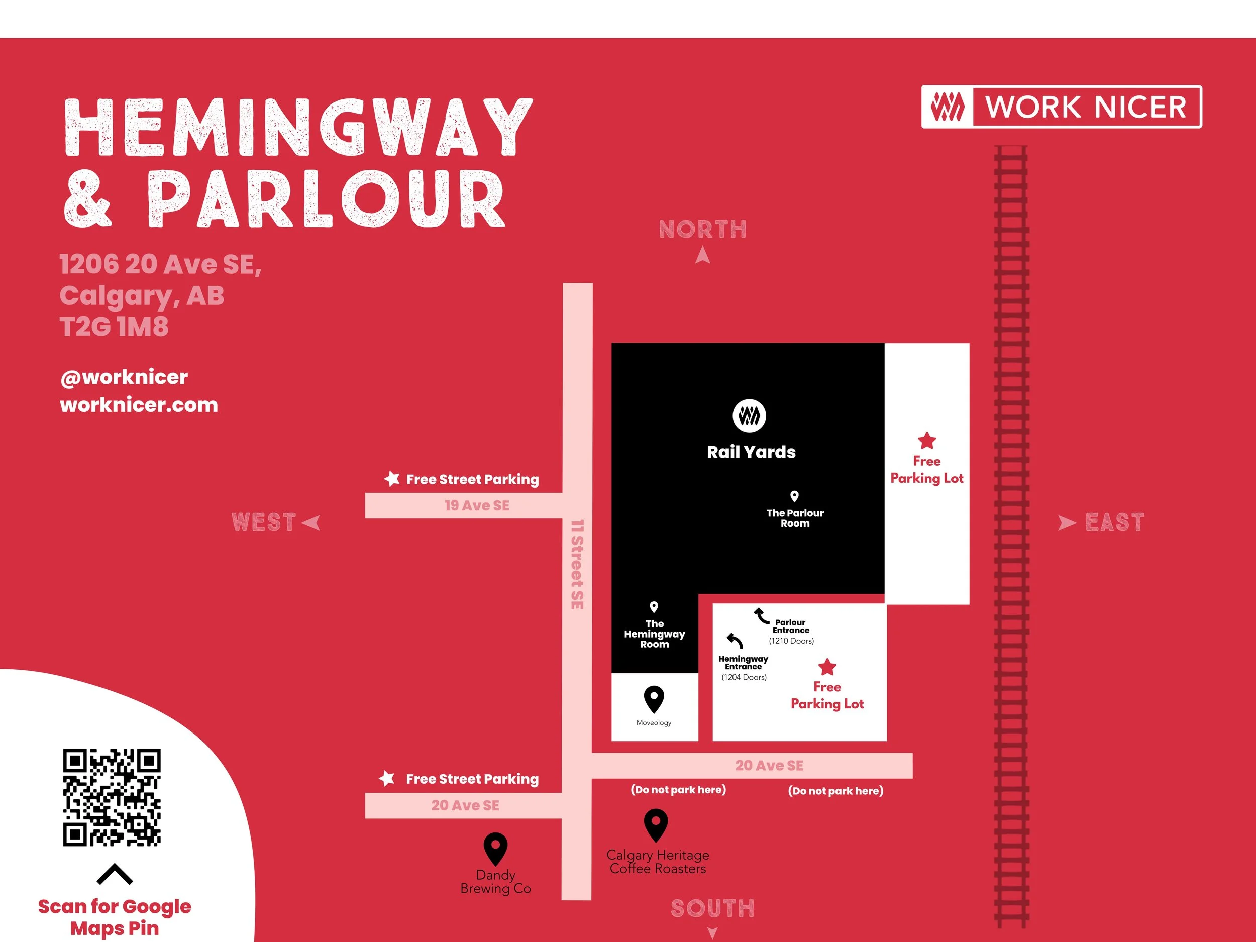 Our venues are in the Ramsay Design Centre, which is a low brick building on the East side of 11 Street SE. Enter through the south parking lot (you’ll see the Barre Body Studio signs near the entrance) and the venue entrance is the main entrance to the building.